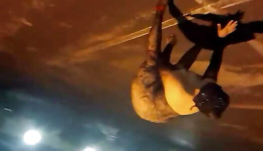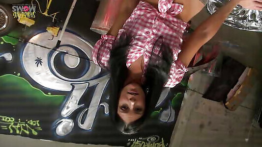 Inside the garage the brunette milf gets her trimmed pussy railed leading to loads of squirting